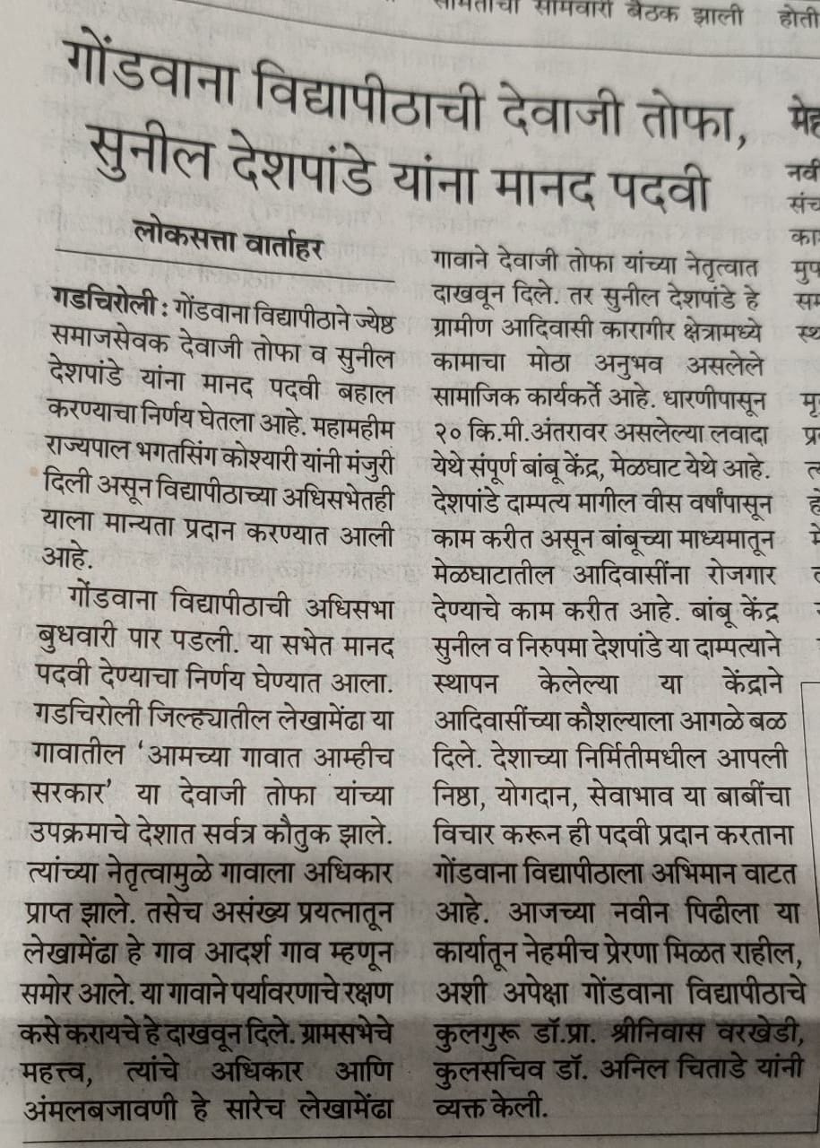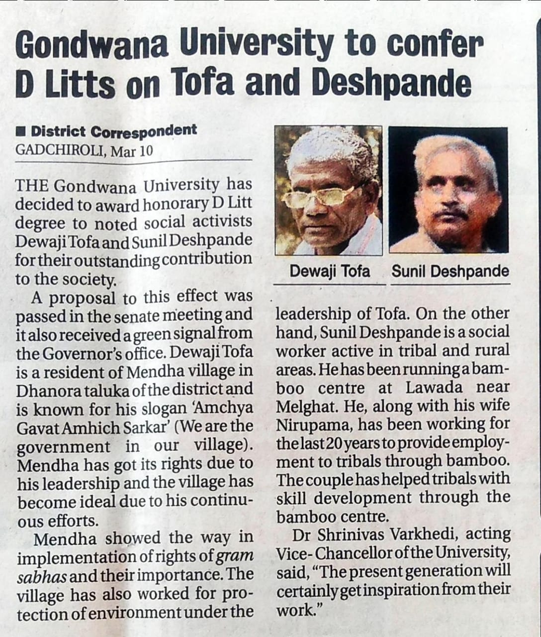 • Major role played in bringing out a Government of Maharashtra order to give each artisan family 1500 Bamboo per year (30 May 1997).